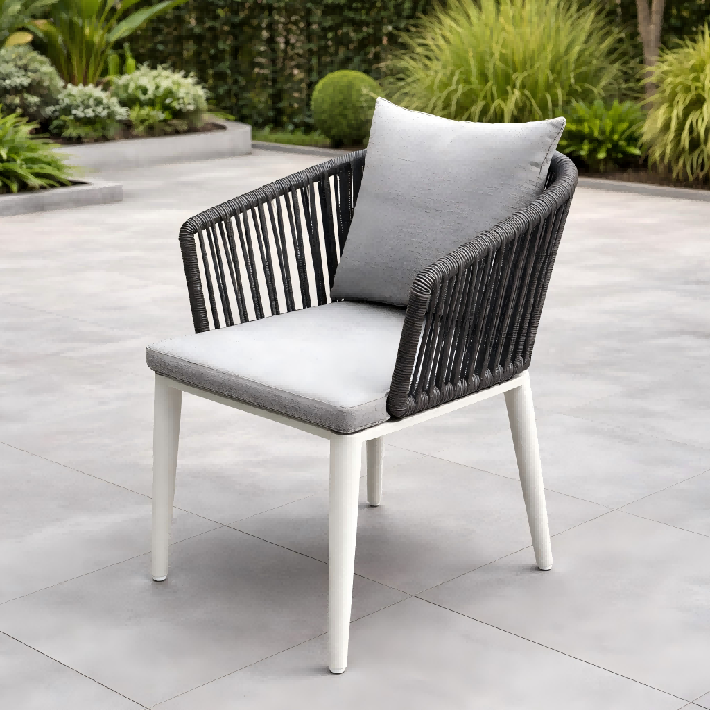 صندلی های ناهار خوری دارای یک تکیه گاه طناب بافته هستند که ظاهری مدرن و ظریف را ایجاد می کنند و در عین حال پشتیبانی راحت را فراهم می کنند. این قاب از آلومینیوم با روکش پودری ساخته شده است که مقاومت بسیار خوبی در برابر زنگ زدگی و شرایط آب و هوایی در فضای باز دارد.